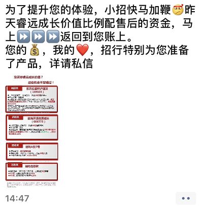 今天招商银行(600036,诊股)刚把资金退回,还不等资金到账,招商银行的渠道销售们就开始给客户们推荐上其他产品了。他们列了一串候选名单,其中包括东方红产品和前海开源的新产品。